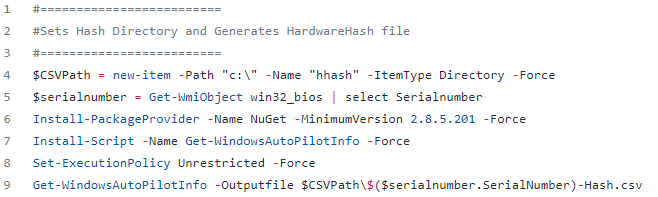 If we pause after section 1 runs, you can see the hardware hash CSV has been created with the serialnumber-Hash as the file name in the C:\hhash directory:
