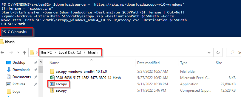 - azcopy.zip is extracted, and the extracted azcopy.exe is copied into the c:\hhash directory