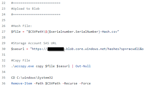 Ever have to deal with trying to enroll a large number of existing devices in autopilot? It can be painful. Especially if they are not already Intune enrolled. I wrote a script that utilizes AzCopy to upload the captured hardware hash to Azure Blob storage. The script must be executed as an administrator, but if you have an RMM agent on your target devices, it can be pushed out with system creds. The script is available on my Github here. Once all your hashes have been gathered, you can merge the CSVs into a single CSV and upload your hashes to Autopilot.