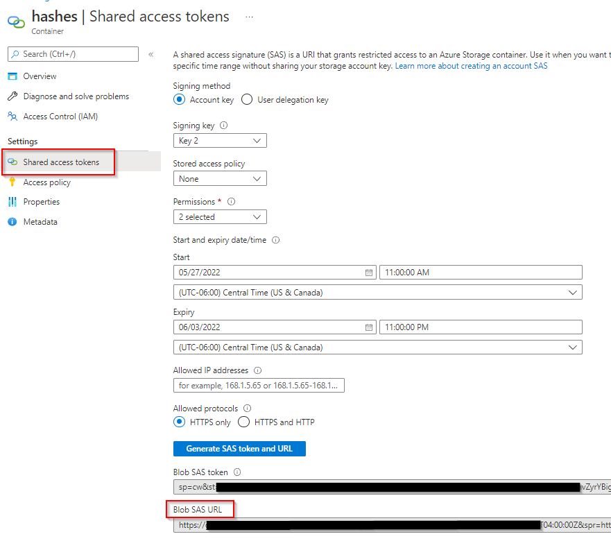 - Select the container and navigate to shared access tokens. Create a key with permissions of create and write, and set your start and expiry times. If you’d like to whitelist IP’s, you can do so here. Select HTTPS only and click the Generate SAS token and URL. Record the SAS URL. This is needed in the script.