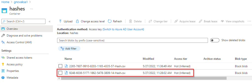 The c:\hhash directory is deleted at the end of the script, so there is nothing to show on the target machine, but if we navigate to our blob storage account, we can see our CSV has been successfully uploaded: