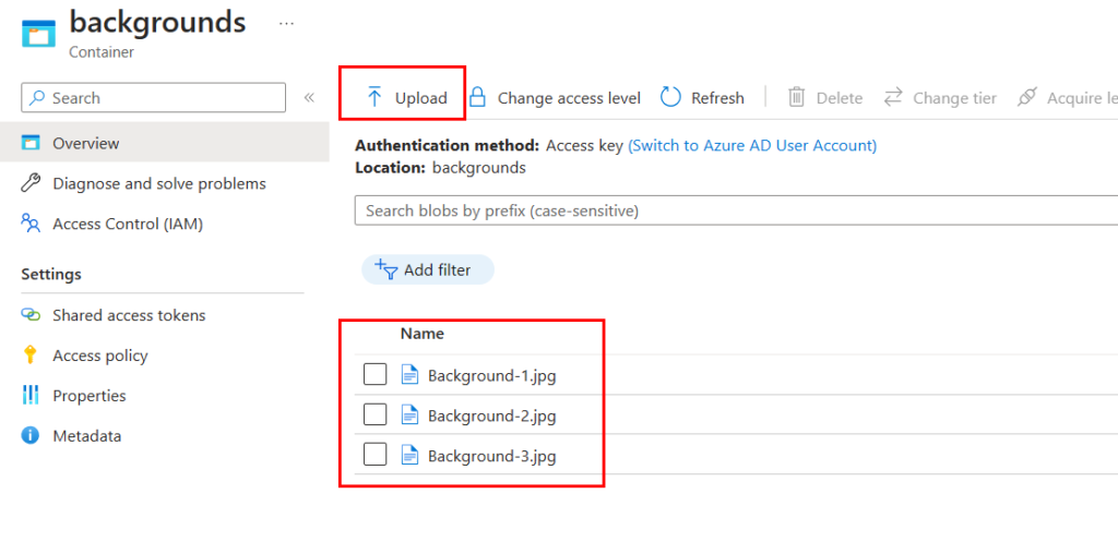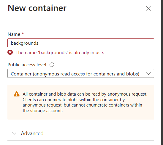 Provide a name for the container and make the public access level “container”, which will allow clients to list the contents of the container and see the blob file details. Since we are dealing with background images for teams, this shouldn’t be an issue for most organizations. However, you can disable public access and specify certain IPs or IP blocks that are allowed to access the storage account if you’d like. You can do this under the networking tab for the storage account.