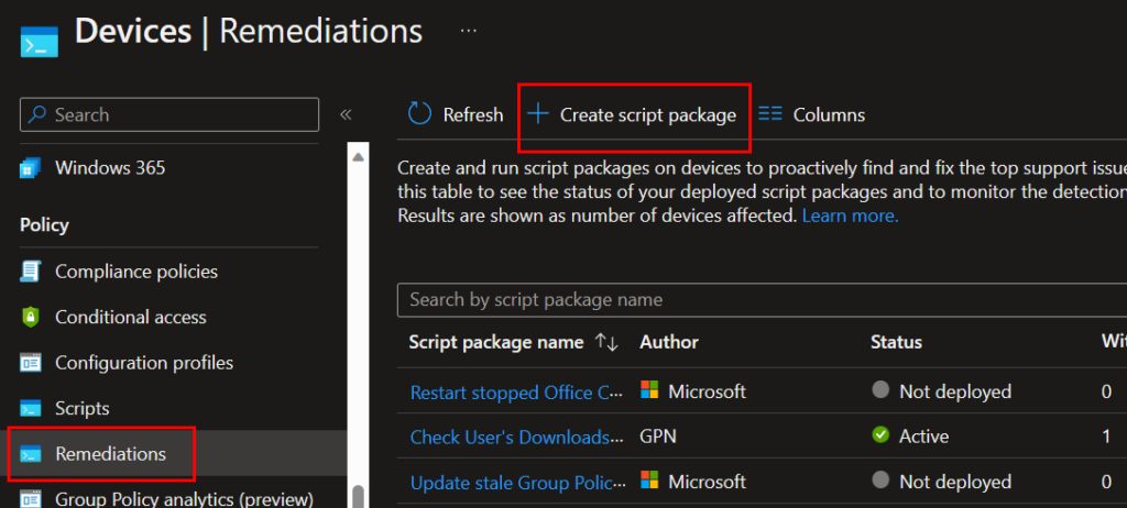 This part is self-explanatory, but we will cover it anyway. Navigate to intune.microsoft.com and select Devices > Remediations and select create script package: