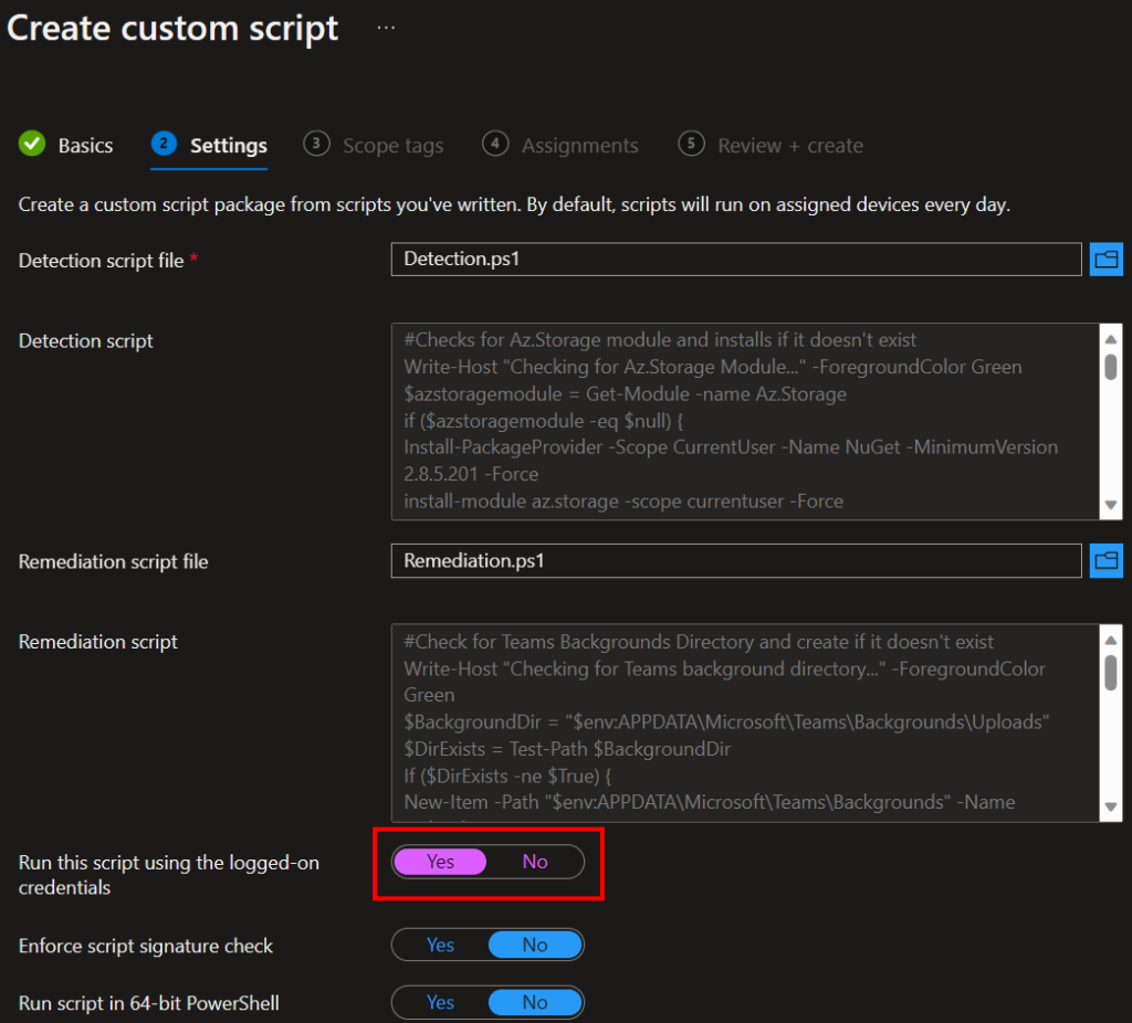 Provide a name and description, and then click next. Browse to the detection and remediation script. Also, make sure you select to run the script as the logged-on user. This is necessary since Teams background images (and most other teams data) is stored in the user’s profile:
