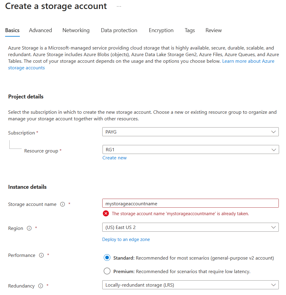 This is straightforward. In Azure, navigate to storage accounts, and create a new one. Provide a resource group and name and click review at the bottom of the screen. We can take all the defaults for this storage account since this will only be used to distribute background images.