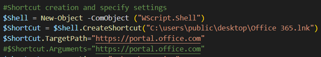 - If you don’t want to specify a browser, you can have it open with the default. Comment out the $Shortcut.Arguments line, and specify your shortcut URL for the value of $Shortcut.TargetPath. See Example below: