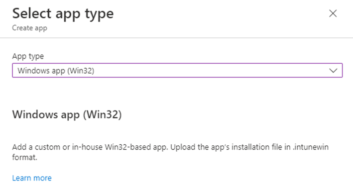 With the intunewin file created, we can create our application and deployment. Sign into Endpoint Manager and create a new Win32 app deployment.