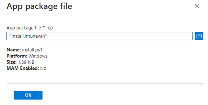 Browse to the install.intunewin file we created. Don’t mind the 1.4KiB size. That’s normal since its just the icon file, and the two scripts.