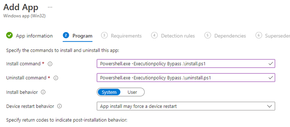 For the install command, we need PowerShell to launch and allow unsigned scripts to run. So, we use the install command Powershell.exe -Executionpolicy Bypass .\install.ps1. The uninstall command is the same, but targets uninstall.ps1. Make sure we install for System since we are targeting the public user desktop.