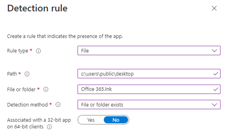 The detection rule is making sure the file exists. Edit the file or folder field to use the name of the shortcut file you used in the install script.