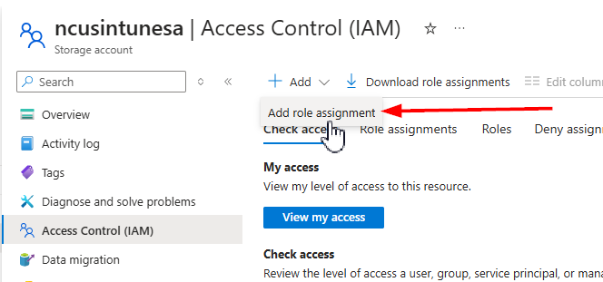 Next, we must grant our Automation Account identity rights to access our storage account. This is so it can list and read the contents of the container and compare those files to the date in our script. Navigate back to your storage account and select Access Control, then Add a new role assignment. We will grant the automation account identity Reader and Storage Account Key Operator Service roles:
