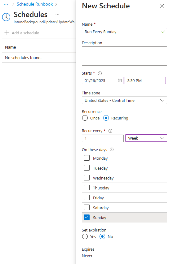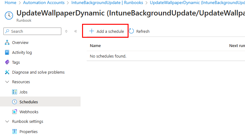 For our schedule, this should run at the same interval you want your images rotated with how they’re named. For example, if you want the images rotated every Sunday so they’re new on the first workday of the week, you’ll want the automation runbook to run on Sunday and your image files to be named as “Background-2025-01-26” then “background-2025-02-02”, and so on to match the date of each Sunday (this is how our example images are named). From the Runbook, click Resources > Schedules, and add a new schedule:
