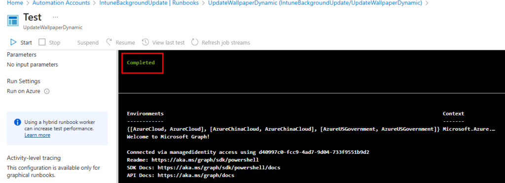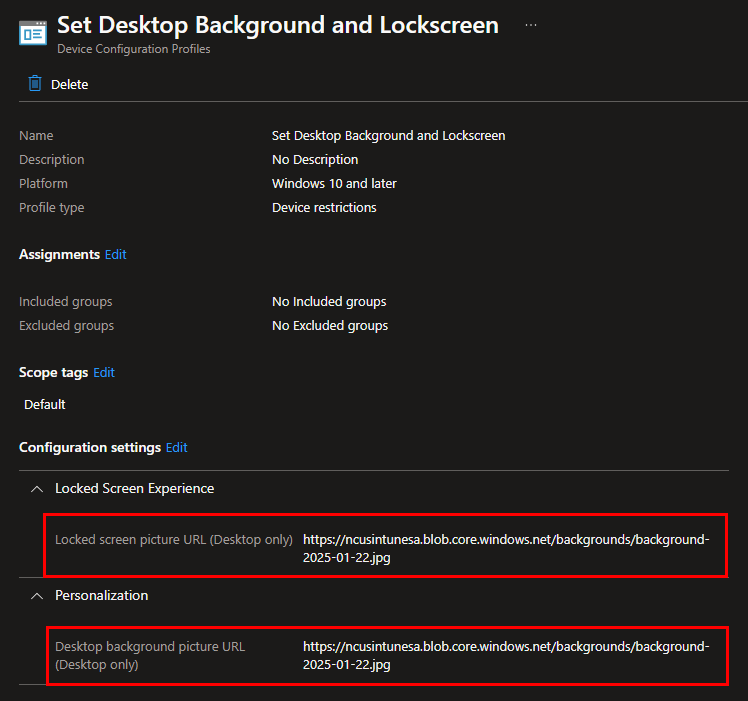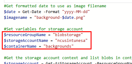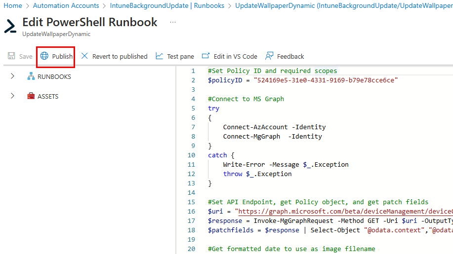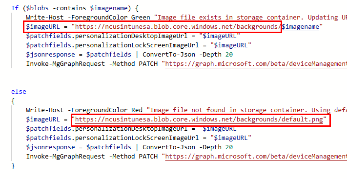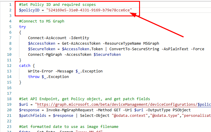 Now, we need to make a few edits to the runbook. We already briefly discussed this, but the runbook is relatively simple. It will connect to both Azure and MS Graph as the Automation Account identity. It gets the current date in the format of “yyyy-MM-dd” and then generates a variable for the image name using “background-$date”. It lists and reads the names of the images in the storage account container to see if it can find a match. Depending on the results, it uses a PATCH API call to update the Intune policy with the new image URL, or the default fallback image if there was no match. I should also mention that this script currently sets the background and lock screen to the same image. If you want separate images, you’ll need to edit the script and the image names you’re uploading. You’ll need the following items so we can edit the runbook script for your environment: