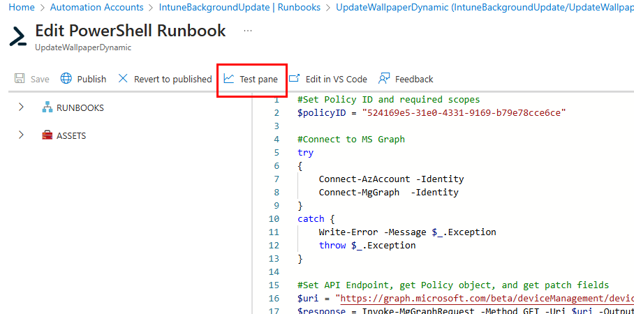 After you’ve made your edits, you can navigate to the test pane to test the runbook: