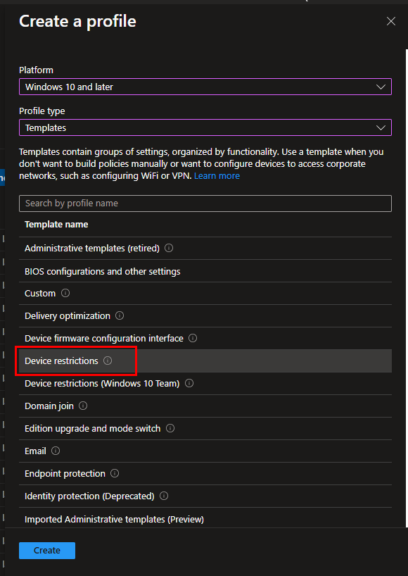 First, we need to create our Intune Policy. Navigate to Device Configuration Policies in Intune. Create a new Profile, and select the Device Restrictions Template: