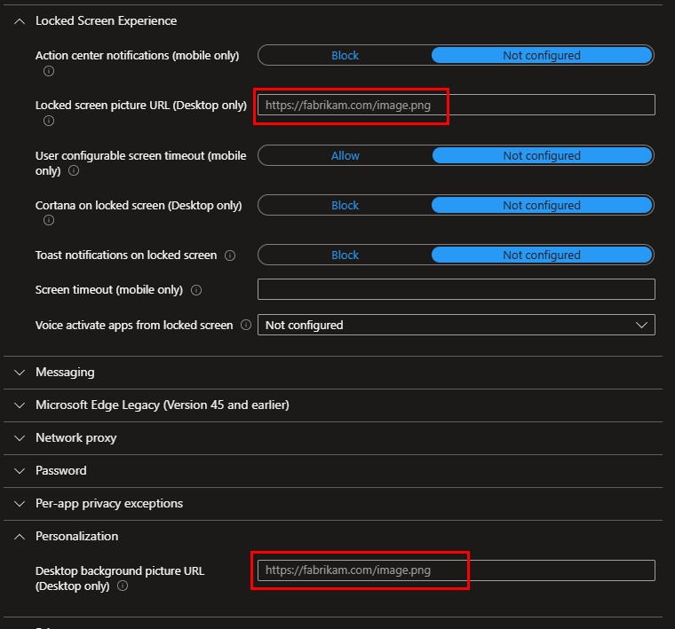 If you already have the URL for your initial image, you can add it to the lock screen and background fields. If not, leave it blank for now and continue with the policy creation.