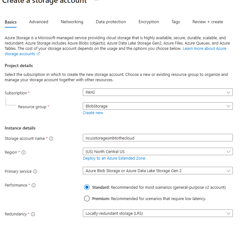 Next, we must create an Azure storage account to hold our background images. Navigate to https://portal.azure.com. Search for storage accounts and create a new one. For something this basic, use the standard SKU and Blob storage as the primary service. Finish creating the storage account—you shouldn’t need to edit anything in the other tabs unless you have specific requirements to do so.