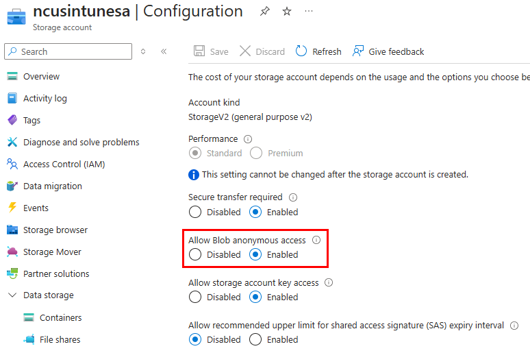 After your SA is created, we need to enable anonymous read access so our endpoints can retrieve images from the container. Under the storage account settings > configuration, select Enabled for Allow Blob anonymous access:
