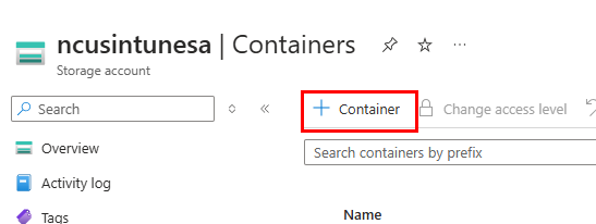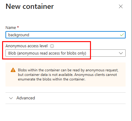 Next, we need to create a container. Under data storage, select Containers and click the + sign. Provide a name, and for the anonymous access level, select anonymous read access for blobs only.
