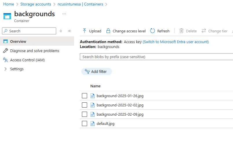 Now we are ready to upload our files. This is important because before uploading them, we must ensure they are correctly named. You don’t need to follow my naming convention if you don’t want to, but you’ll need something to identify the files based on the date. So, I used the naming convention “background-YYYY-MM-DD. Where the date on the file was the date we wanted it implemented. In this case, every Sunday. Our runbook script will run each Sunday and look for a file that starts with “background-” and ends with the date of that Sunday. I also have a default.jpg image uploaded. If the script can’t find a match on the file for that week, it will use the default background image. Here’s how my files look: