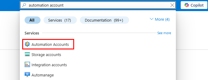 Now that we have created our Intune policy and images named and uploaded to our storage account, we need to make the engine that will work for us. For that, we will use an Azure Automation Runbook. From Azure, search for and select Automation Accounts: