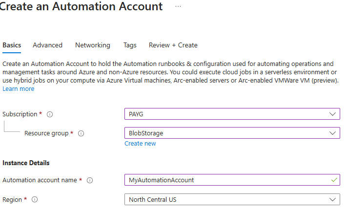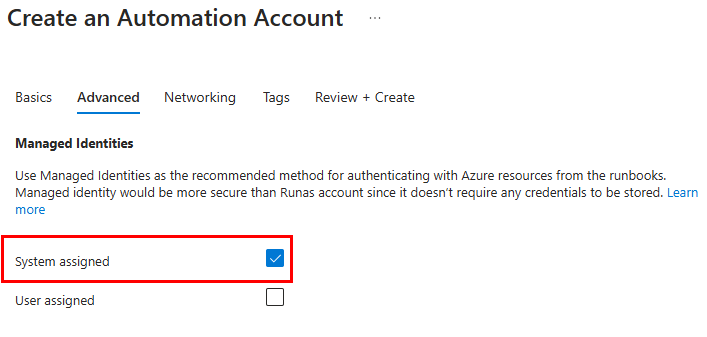 Create a new Automation Account. Complete the required fields and make sure system-assigned managed identity is selected under the Advanced tab: