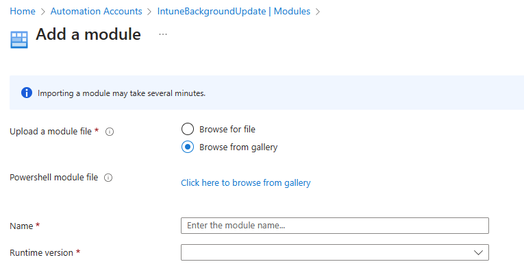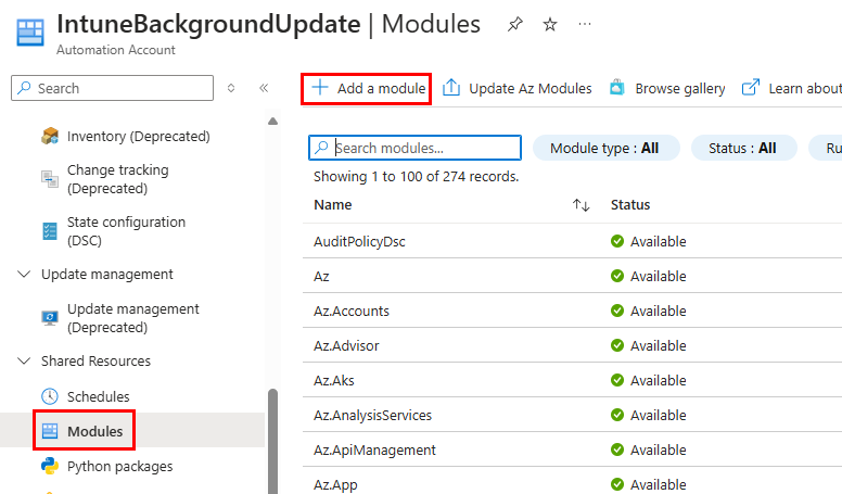 After adding the role assignments, navigate back to the Automation Account. Under Shared Resources, select Modules and then click Add a module: