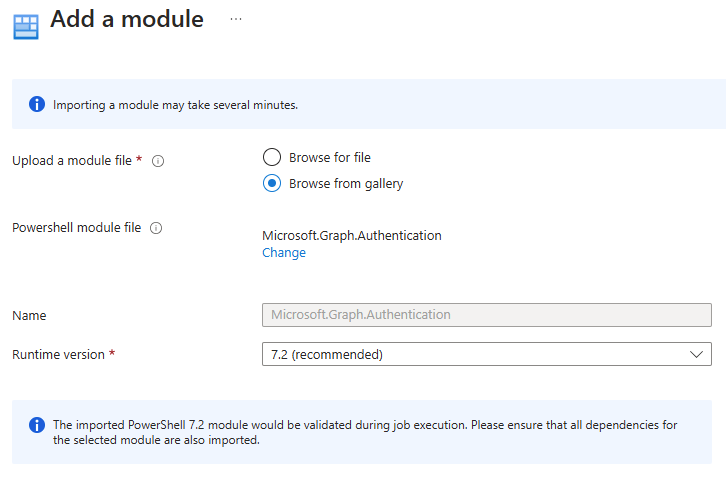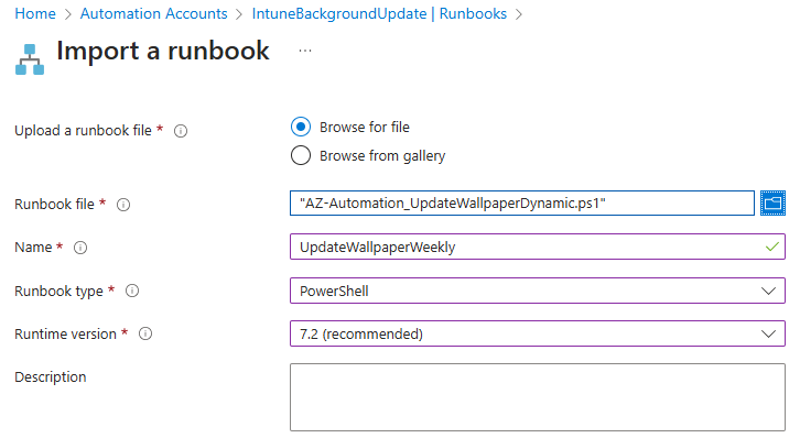 Select to browse for a file and select the runbook script we just downloaded. Provide a name and select runtime version 7.2. Click Import when finished.