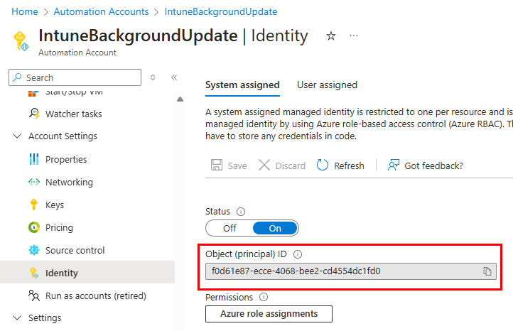 Copy your automation account’s ID and use it in the script below for the $serviceprincipalId variable. The rest of the script can be left alone and will do the rest for you. Essentially, this script looks for the permission IDs for each of the objects set in the permissions array, retrieves the permission ID, and assigns it to the automation account’s identity. This short script assumes you already have the Microsoft.Graph.Authentication module installed. The rest of it is requires the Microsoft.Graph.Applications module. Setting these permissions allows the automation account to make the necessary changes to the Intune policy when it runs at its scheduled interval.