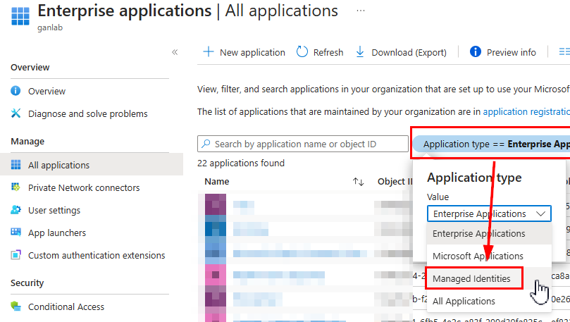 To verify that the permissions were correctly set, you can navigate to enterprise applications in Entra, select Managed Identities as the application type: