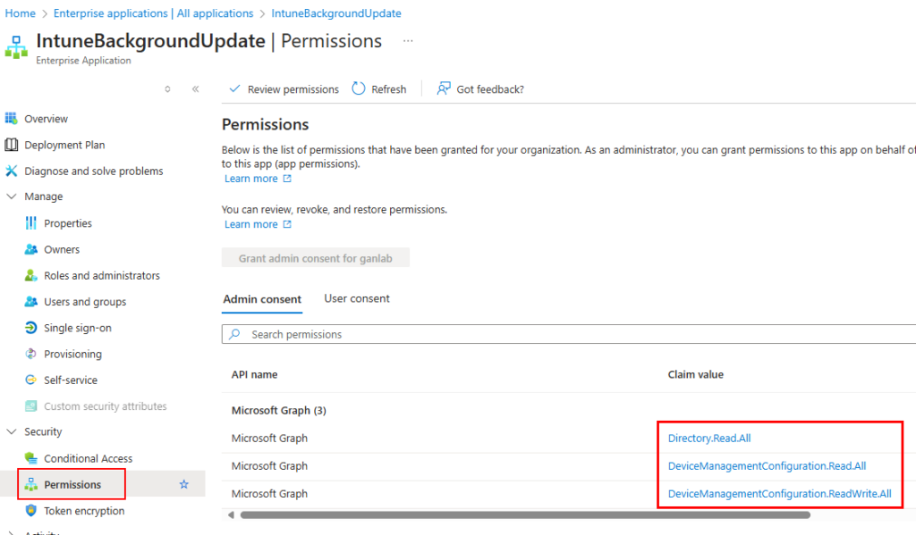 Select your Automation Account identity and select security > permissions. You’ll see below that we have the Graph Permissions