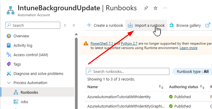 Now we can add and test our runbook script. Download the runbook script from Github. Then, go back to your automation account and select Runbooks, and Import a Runbook:
