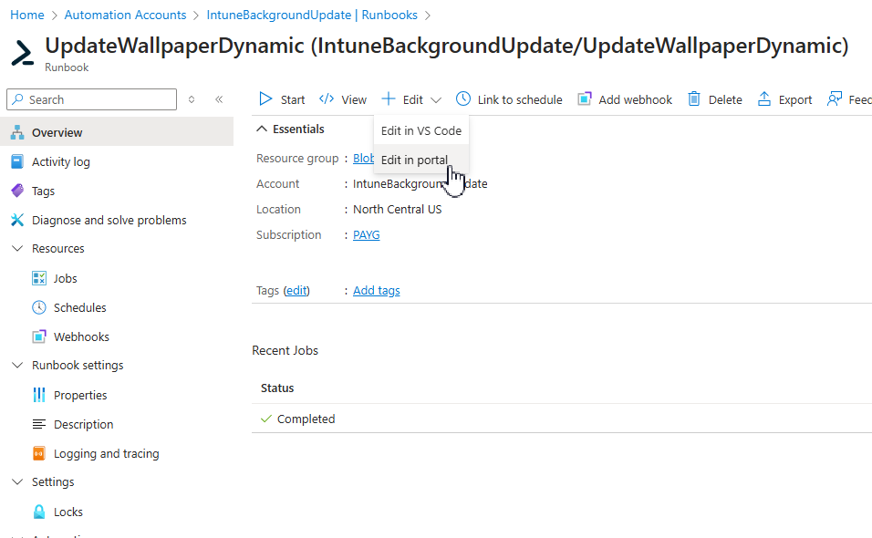 Navigate to the runbook in Azure and click Edit at the top of the screen. For quick edits, we can select edit in Portal: