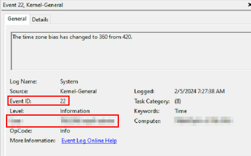 Initial troubleshooting started in the system event log. We can see event ID 22 in the screenshot below, indicating a time zone change. In this case, the time zone was changed back to the desired time (Mountain Standard Time) with a time bias of 420. The Time bias is the difference in minutes from UTC 0. A list of the time zone biases is also below: