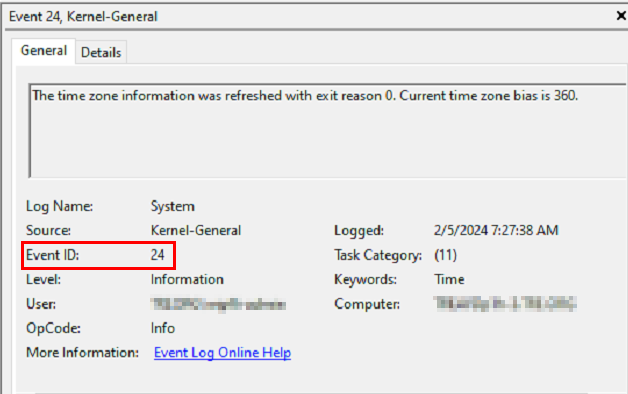 We can see the name of the user who initiated the time change in the event. This is strange because this is not an admin user and the time zone is being set by policy, so they should not be allowed to change it. We also see Event 24 right after Event 22, confirming that the time zone was refreshed to US Central Time: