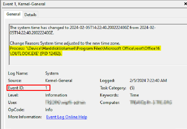 After contacting that user, they insisted they did not change the time zone of the computer and I confirmed their account did not have permission to change the time zone in Windows. However, some more digging led to event ID 1, indicating that the system time zone was changed by Outlook and also showed the process ID for the Outlook instance: