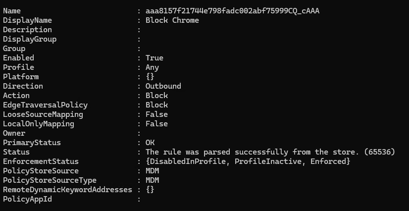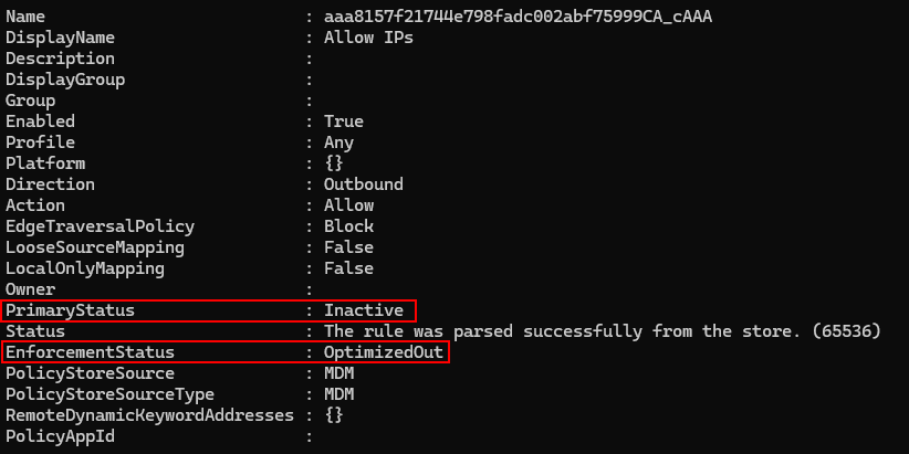 And then you can confirm they are active by using PowerShell command Get-NetFirewallRule -PolicyStore ActiveStore. The additional MDM added rules should be listed at the bottom: