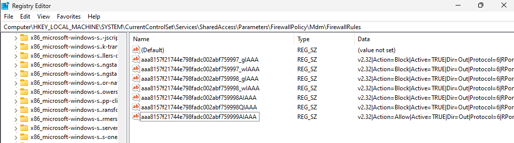 After the policy is applied, you can confirm the rules have been added by navigating to HKLM\System\CurrentControlSet\Services\SharedAccess\Parameters\FirewallPolicy\MDM\FirewallRules: