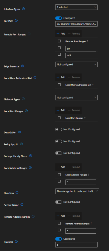 So, if you’re using this method, you’ll likely be blocking all Internet traffic from your targeted apps. So, you don’t get as much flexibility with the ability to make exclusions by domain name. Nevertheless, this will still block port 80/443 internet traffic for browsers or other apps, if needed. One other thing I should mention is I did not explore any ADMX files for Firefox, Brave, etc. They may have equivalent settings we discussed in option 1, but you’ll need to check that if it applies to you and import the ADMX file.