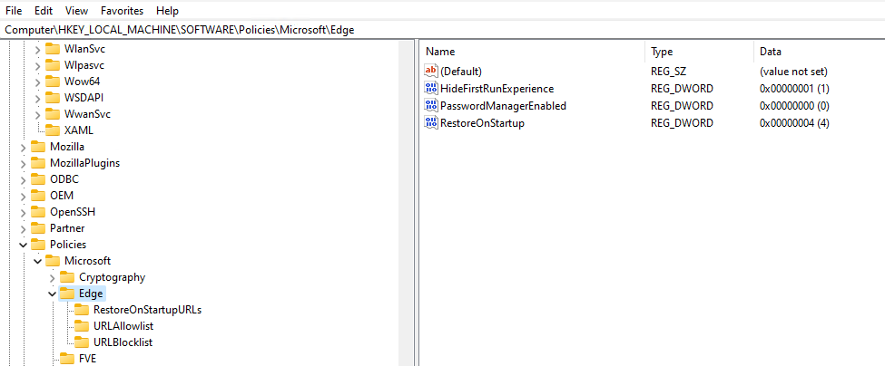 If you’re wondering where these settings are applied on the local device, or you want to confirm your policies are being applied, you can visit the registry key HKLM\Software\Policies\Microsoft\Edge. There are a few subkeys with corresponding values we set in the configuration policy.