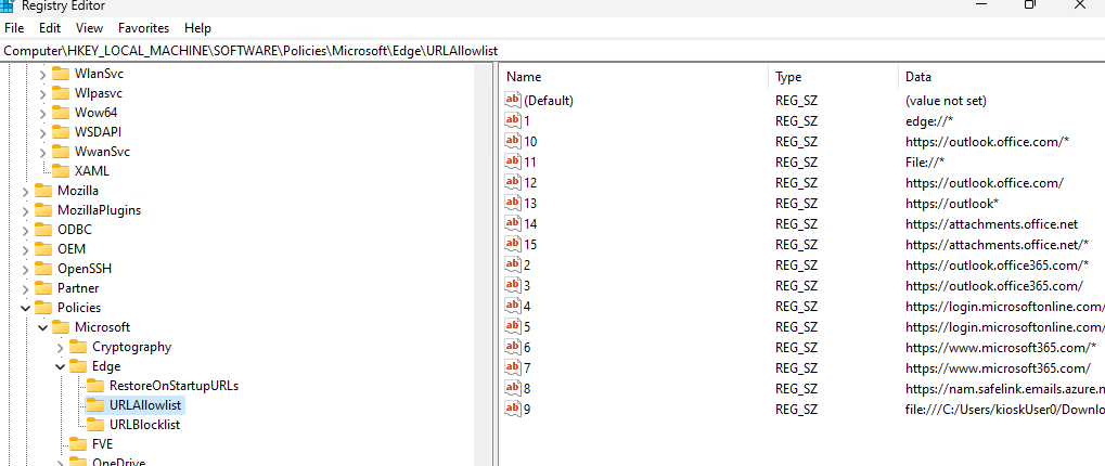 HKLM\Software\Policies\Microsoft\Edge\URLAllowlist: