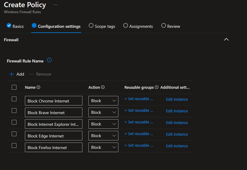 Here’s an example firewall policy that blocks common browsers from accessing the internet. This policy can be added to your tenant by running this script if you’d like to use it as a template.