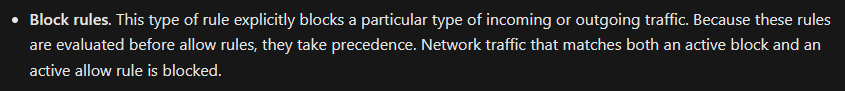 I tried making exclusions anyway just to see what happens. You’ll end up having your allowed rules “optimized out”, meaning they are irrelevant and won’t change what is blocked/allowed.