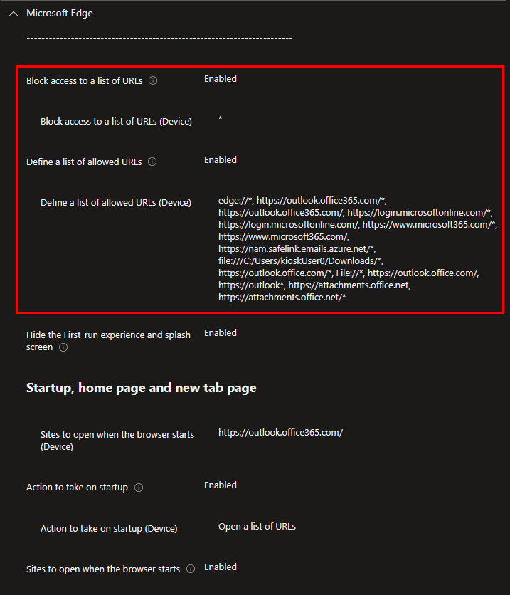 In addition to those highlighted settings, the example policy shown above does a few more things if you want to do more than simply whitelist certain sites. For example, I did a Kiosk setup for an organization several months ago where they only wanted to allow access the web version of outlook, but also allow the user to download/view PDF file attachments. By using Edge as the PDF viewer, we whitelisted the download location and additional URLs for safe attachments. Some additional settings to hide the first run experience and to open the browser to web Outlook are also in this policy. This policy uses Edge, but all the equivalent settings are available in Chrome, also.
