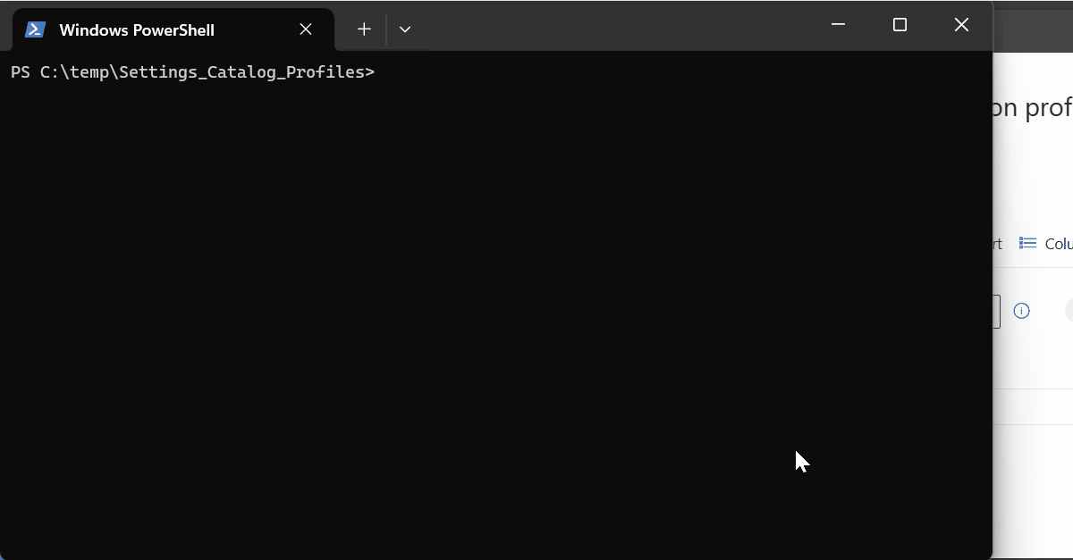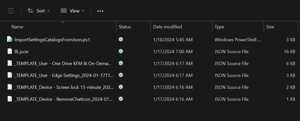 After you’ve exported all your profiles, put all the JSON files in the same folder. Then, download this script from my github and place it in the same directory as your settings catalog profile .json files. Make sure there aren’t any other non-settings catalog JSON files in that directory.