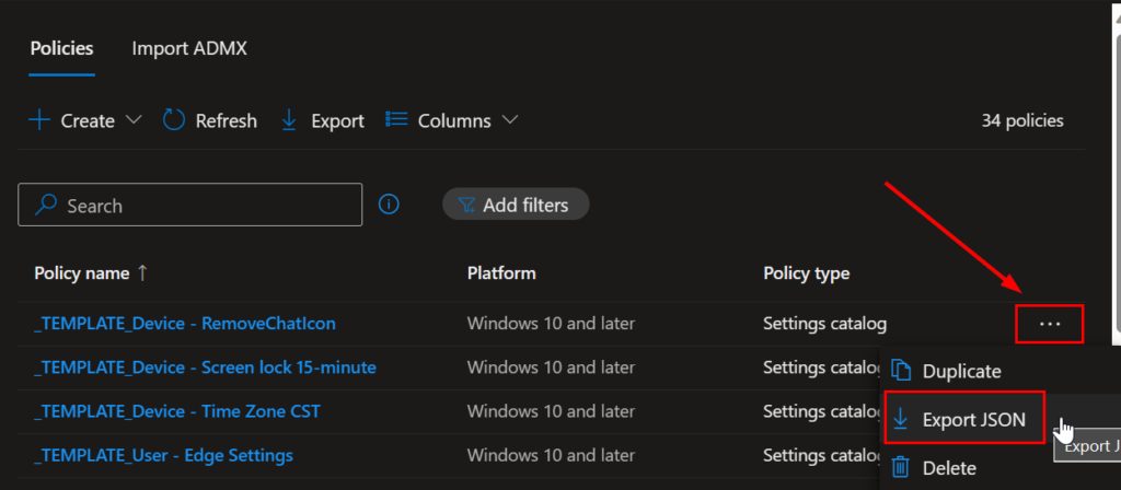 First, you’ll need to export the configuration settings profiles that you want to use. I have several profiles that I deploy to almost every client. To export a configuration profile, navigate to Intune > Devices > Device Configuration Profiles. Locate the policies you want to export, click the ellipses next to them, and select export JSON.