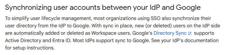 We also don’t want to manage two separate Identity platforms. So, in this situation, we can use Entra as the primary identity provider, so Google Workspace syncs users from Entra and uses Entra as the IDP and SSO provider. There is some documentation already out there from Google and Microsoft, but I felt like it was out of order or missing some information – especially when it comes to user provisioning on the Google Workspace side. So, this post walks through the setup for SSO and automatic sync for user provisioning/deprovisioning. We will start with configuring SSO and then get into the automatic user provisioning.