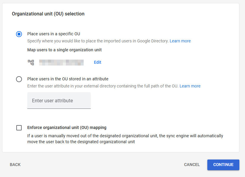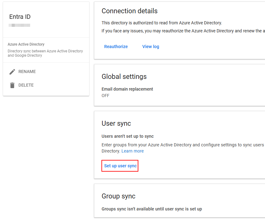 - Now, we can configure user sync. Back in Google Workspace Admin center > Directory > Directory Sync. Select the External Directory we just created. Select set up user sync: