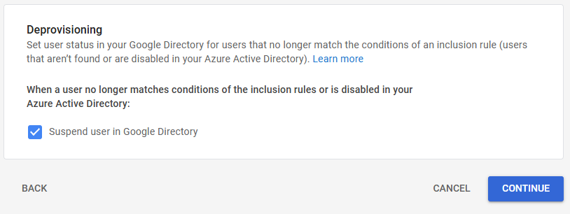 - Set the action for user de-provisioning and click continue. Suspend is the default and is equivalent to disabling a user in Entra.