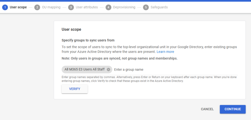 - You must select an M365 user group or groups for the users you want to sync. After entering your group or groups, click Verify, then continue. If you are just getting started and want to test with a small group of pilot users, create a pilot group in Entra.